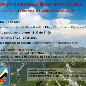Objavljen je plan izleta HPD Pliva za 2026. godinu koji je sada dostupan na linku: Plan planinarskih izleta za 2026. godinu – myteva intranet.Pozivamo sve članove i zaljubljenike u planine da zavire u plan i unaprijed isplaniraju svoje avanture. Također najavljujemo da je u pripremi Opća planinarska škola, koja će se održavati od ožujka do… Nastavi čitati »
